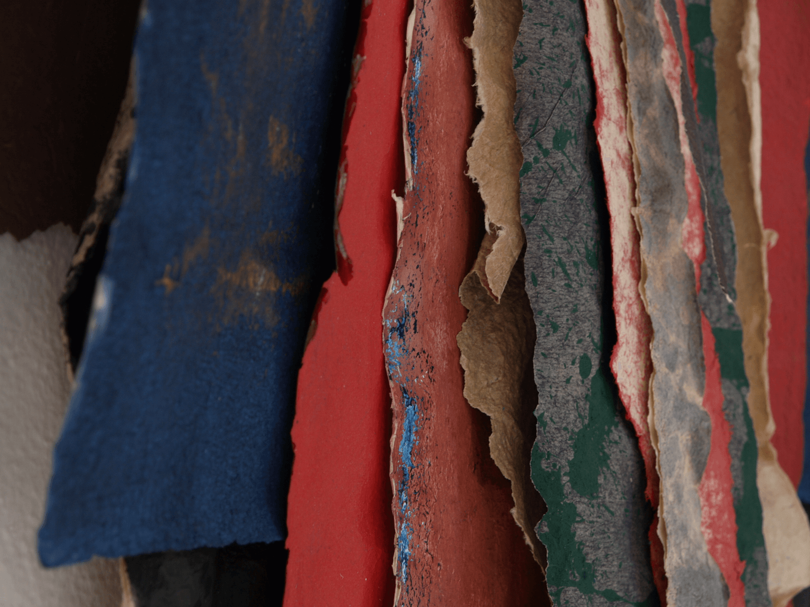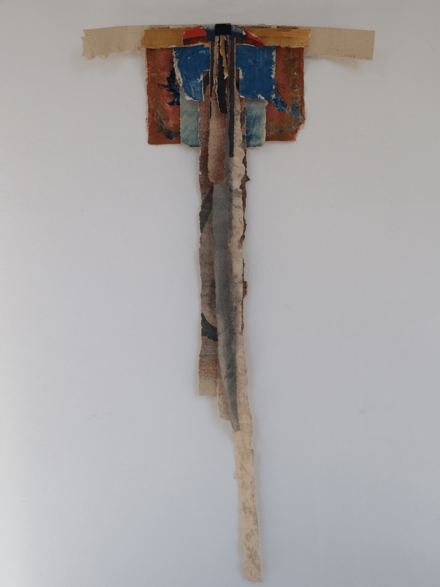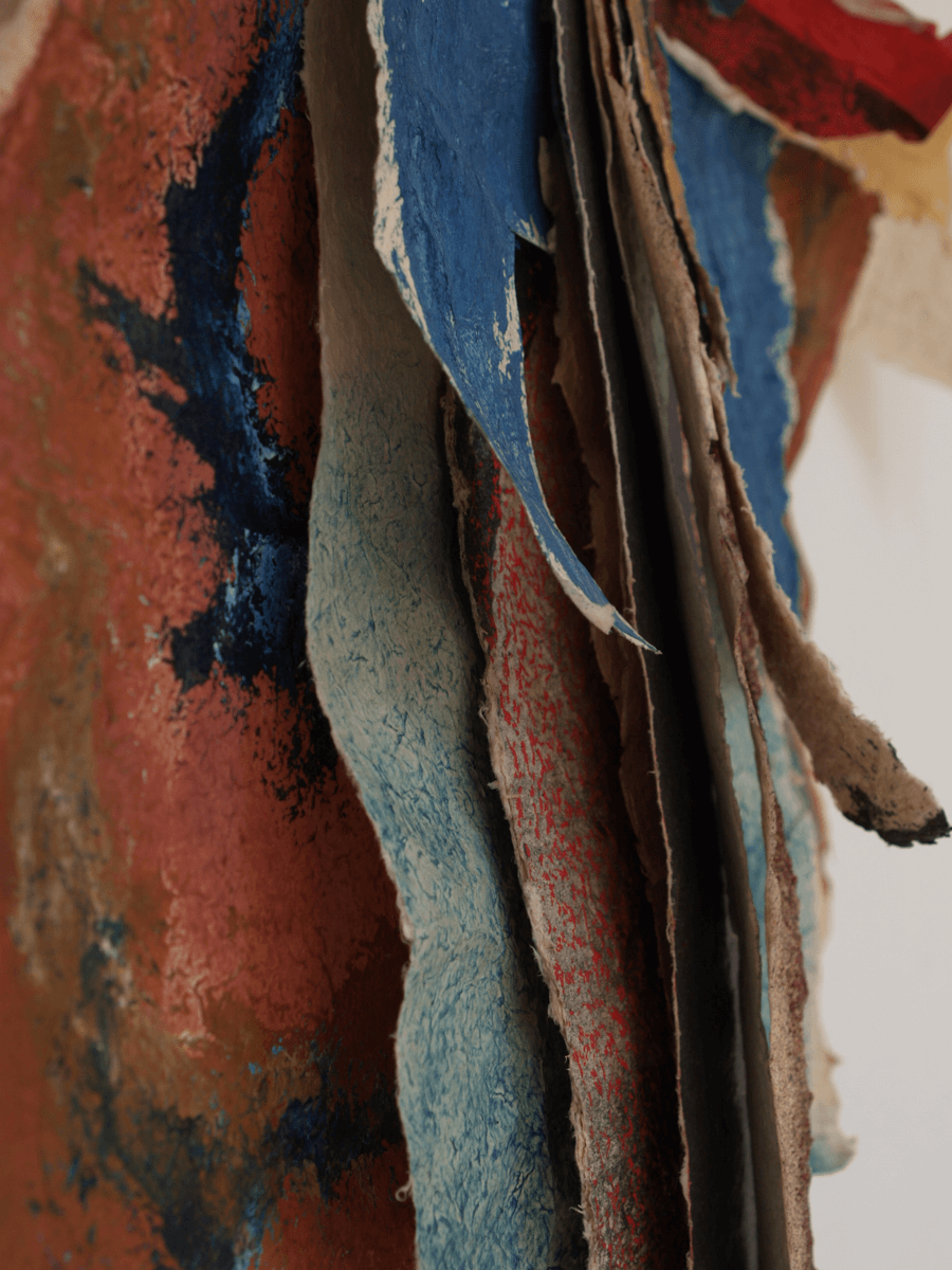Beings that hover on the space. Colored paper streamers that rock in a sway, between surface and space, between image and figure. Features that crucify, dissect and dry out for transformation.